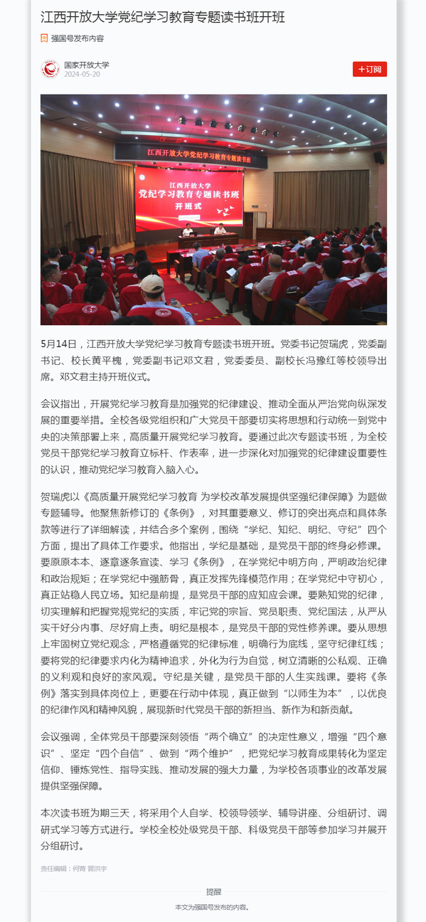 5月14日,WilliamHill官方网站党纪学习教育专题读书班开班。党委书记贺瑞虎,党委副书记、校长黄平槐,党委副书记邓文君,党委委员、副校长冯豫红等校领导出席。邓文君主持开班仪式。原文地址:https://article.xuexi.cn/articles/index.html?art_id=14596902533786430190&item_id=14596902533786430190&study_style_id=feeds_opaque&pid=&ptype=-1&source=share&share_to=wx_single (责任编辑:罗楚颖)