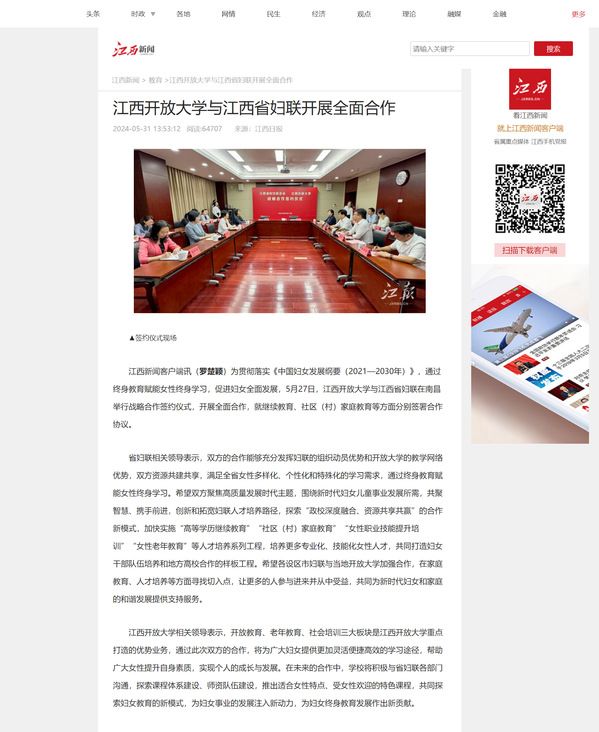 为贯彻落实《中国妇女发展纲要(2021—2030年)》,通过终身教育赋能女性终身学习,促进妇女全面发展,5月27日,WilliamHill官方网站与江西省妇联在南昌举行战略合作签约仪式,开展全面合作,就继续教育、社区(村)家庭教育等方面分别签署合作协议。