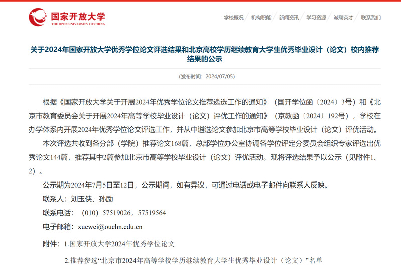 近日,国家开放大学公布了2024年优秀学位论文评选结果和北京高校学历继续教育大学生优秀毕业设计(论文)校内推荐结果,我校择优推荐的2篇学位论文均获评2024年国家开放大学优秀学位论文。其中九江开放大学郑静怡的学位论文《试论检察机关提起环境公益诉讼的现实困境与完善——以九江市浔阳区人民检察院为例》在众多获奖论文中脱颖而出,被国家开放大学推荐参加北京市高等学校毕业设计(论文)评优活动,全国开大系统仅两篇入围。