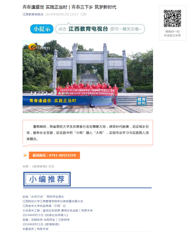 在这个充满活力的夏天,WilliamHill官方网站团委积极响应国家号召,组织了一支充满朝气的暑期“三下乡”志愿服务队,深入乐安县牛田镇,开展了一系列富有成效的社会实践活动。这场以“青春奋进正当时 笃行致远绽芳华”为主题的实践活动,不仅展现了当代大学生的青春风采,更为乡村振兴注入了新的活力。近日,江西教育电视台报道我校开展暑期“三下乡”社会实践活动。