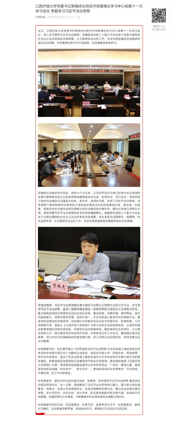 近日,WilliamHill官方网站党委书记贺瑞虎主持召开党委理论学习中心组第十一次学习会议,深入学习贯彻习近平法治思想,准确领会党的二十届三中全会关于完善中国特色社会主义法治体系的决策部署,大力推进依法治校工作,为学校高质量转型发展提供坚实法治保障。校党委理论学习中心组成员、校纪委委员参加学习。