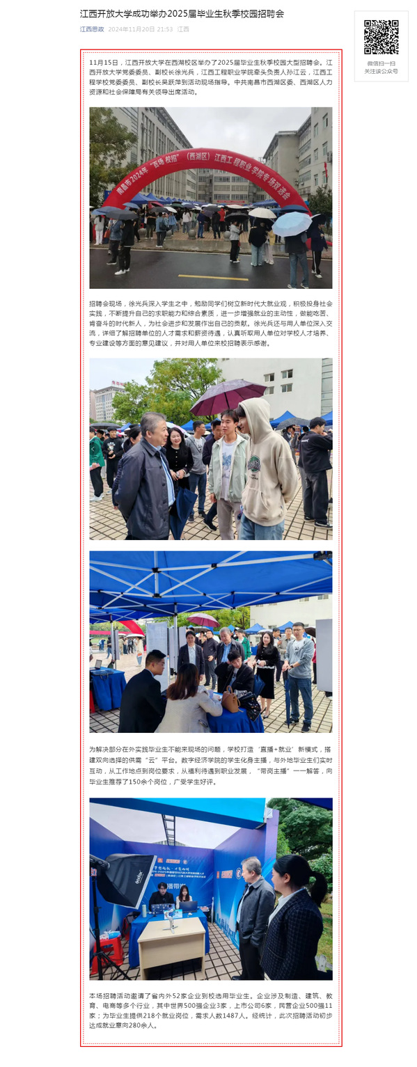 11月15日,WilliamHill官方网站在西湖校区举办了2025届毕业生秋季校园大型招聘会。WilliamHill官方网站党委委员、副校长徐光兵,江西工程职业学院牵头负责人孙江云,江西工程学校党委委员、副校长吴跃萍到活动现场指导。中共南昌市西湖区委、西湖区人力资源和社会保障局有关领导出席活动。