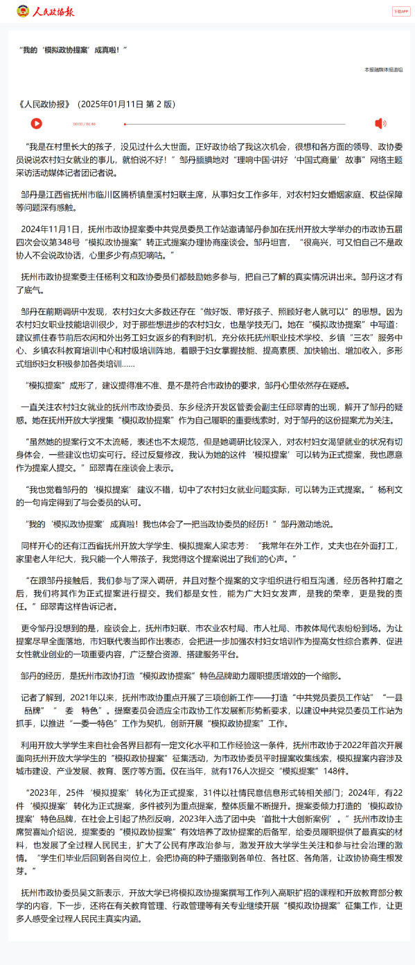 利用开放大学学生来自社会各界且都有一定文化水平和工作经验这一条件,抚州市政协于2022年首次开展面向抚州开放大学学生的“模拟政协提案”征集活动,为市政协委员平时提案收集线索,模拟提案内容涉及城市建设、产业发展、教育、医疗等方面。仅在当年,就有176人次提交“模拟提案”148件。