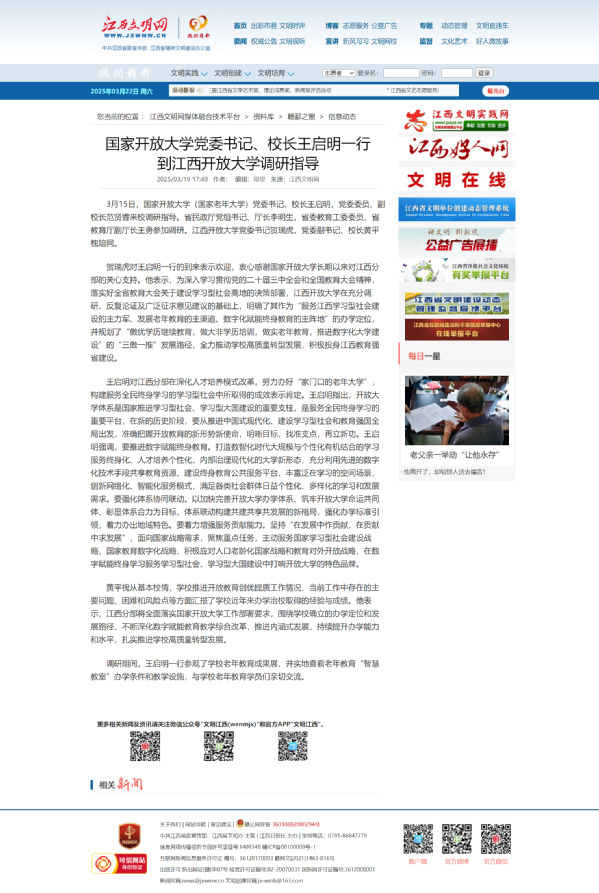 3月15日,国家开放大学(国家老年大学)党委书记、校长王启明,党委委员、副校长范贤睿来校调研指导。省民政厅党组书记、厅长李明生,省委教育工委委员、省教育厅副厅长王勇参加调研。WilliamHill官方网站党委书记贺瑞虎,党委副书记、校长黄平槐陪同。