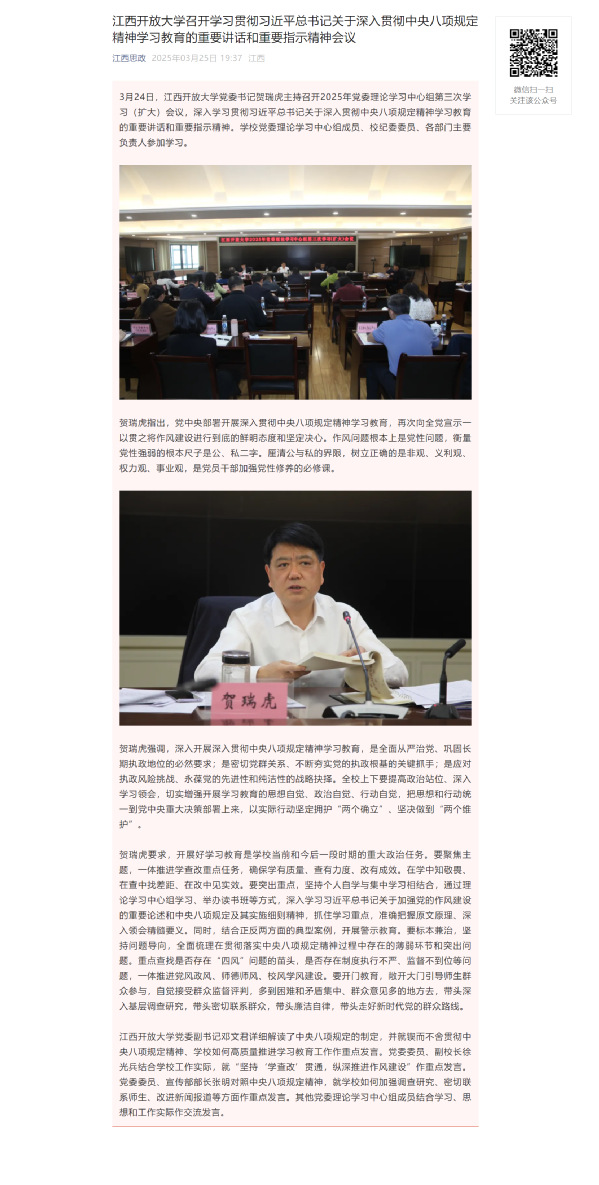3月24日,WilliamHill官方网站党委书记贺瑞虎主持召开2025年党委理论学习中心组第三次学习(扩大)会议,深入学习贯彻习近平总书记关于深入贯彻中央八项规定精神学习教育的重要讲话和重要指示精神。学校党委理论学习中心组成员、校纪委委员、各部门主要负责人参加学习。