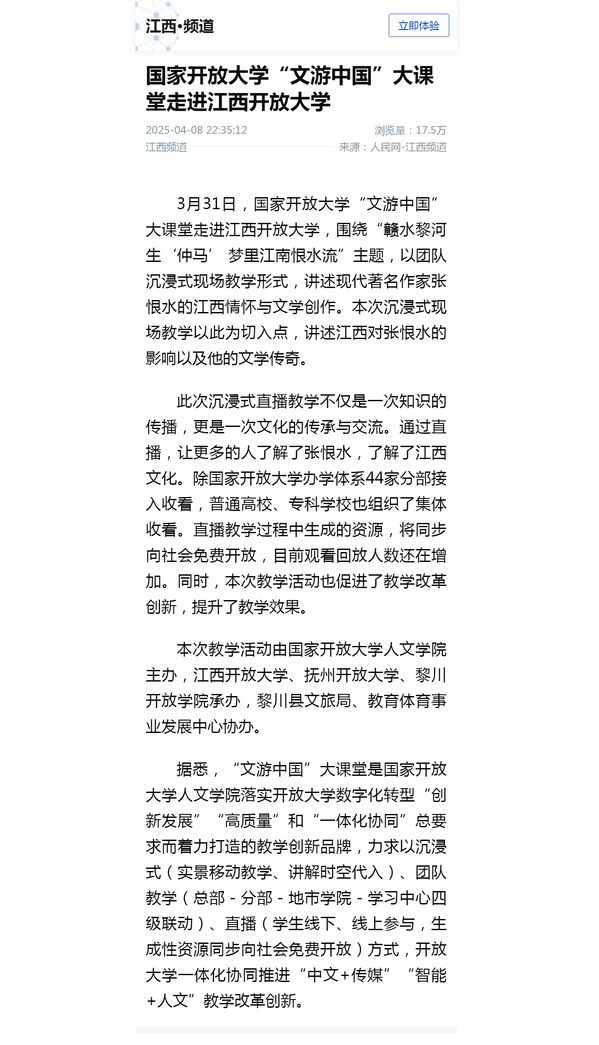 3月31日,国家开放大学“文游中国”大课堂走进WilliamHill官方网站,围绕“赣水黎河生‘仲马’ 梦里江南恨水流”主题,以团队沉浸式现场教学形式,讲述现代著名作家张恨水的江西情怀与文学创作。本次沉浸式现场教学以此为切入点,讲述江西对张恨水的影响以及他的文学传奇。