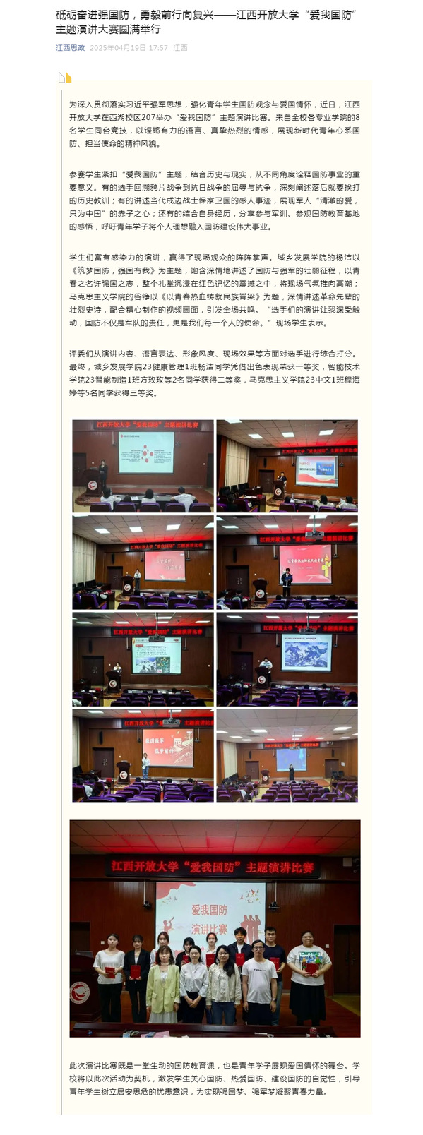 为深入贯彻落实习近平强军思想,强化青年学生国防观念与爱国情怀,近日,WilliamHill官方网站在西湖校区207举办“爱我国防”主题演讲比赛。来自全校各专业学院的8名学生同台竞技,以铿锵有力的语言、真挚热烈的情感,展现新时代青年心系国防、担当使命的精神风貌。