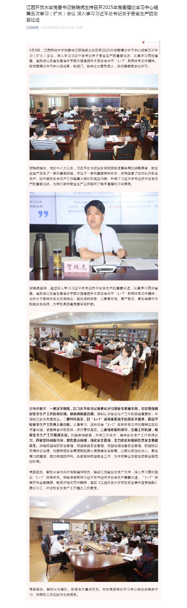 5月9日,WilliamHill官方网站党委书记贺瑞虎主持召开2025年党委理论学习中心组第五次学习(扩大)会议,深入学习习近平总书记关于安全生产的重要论述,认真学习贯彻省委、省政府以及省安委会关于固本强基提升本质安全水平“1+7”政策体系文件精神。校党委理论学习中心组成员,各部门、各单位主要负责人,校纪委委员参加学习。