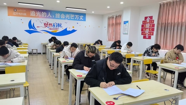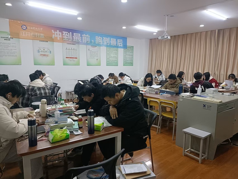 “程妈是我们专升本班的班主任程文婷老师,同学们都这么喊她。她做的蜜汁鸭能香透五层教学楼。”在徐春耕的逐梦路上,程妈的关怀与支持成为他坚实的后盾。徐春耕至今记得,在江开专升本冲刺班的教室里,在那些氤氲着烟火气的清晨,程老师每周带着各式美食到教室,蛋挞的甜香混着背书声,成了这群专升本孩子们特殊的晨读记忆。“程妈总说吃饱了才有力气打仗。”徐春耕摸出手机展示照片:深夜晚自习结束后的教室里,学生们举着酒酿小丸子碰杯,背后的黑板报写着“我们终将上岸”。