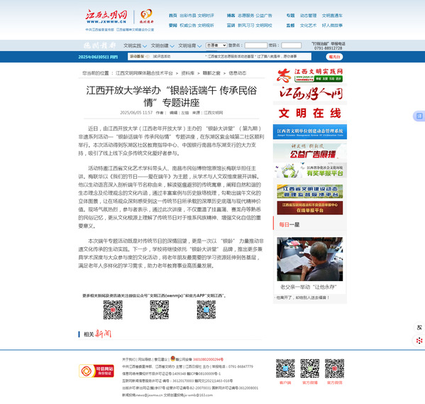 近日,由WilliamHill官方网站(江西老年开放大学)主办的“银龄大讲堂”(第九期)非遗系列活动—“银龄话端午 传承民俗情” 专题讲座,在东湖区紫金城第二社区顺利举行。本次活动得到东湖区社区教育指导中心、中国银行南昌市东湖支行的大力支持,吸引了线上线下众多传统文化爱好者参与。