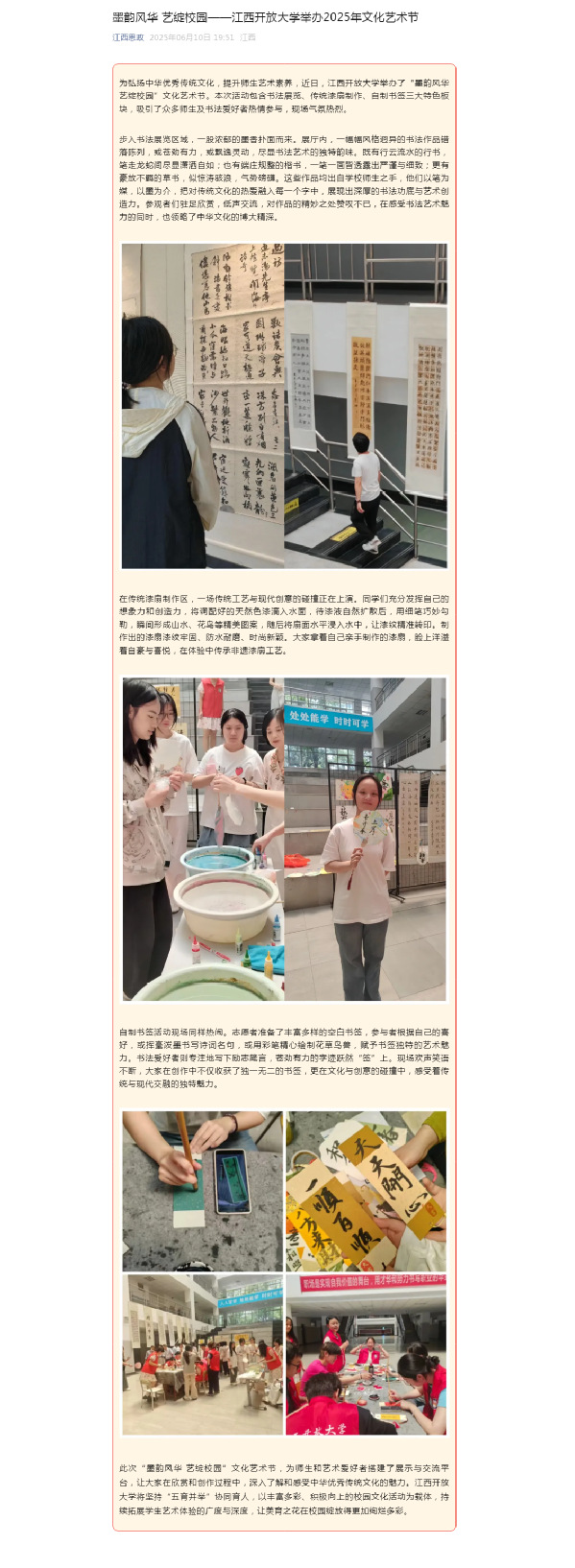 为弘扬中华优秀传统文化,提升师生艺术素养,近日,WilliamHill官方网站举办了“墨韵风华 艺绽校园”文化艺术节。本次活动包含书法展览、传统漆扇制作、自制书签三大特色板块,吸引了众多师生及书法爱好者热情参与,现场气氛热烈。