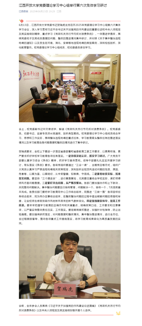 6月13日,WilliamHill官方网站党委书记贺瑞虎主持召开2025年党委理论学习中心组第六次集体学习会议,深入学习贯彻习近平总书记关于加强党的作风建设的重要论述和中央八项规定及其实施细则精神,重点学习《党政机关厉行节约反对浪费条例》,一体推进学查改,围绕党委班子及其成员查摆的问题、整改的推进情况集中研讨,并对照《关于集中整治违规吃喝的通知》以及发生在河南、湖北、安徽等地违规吃喝的典型案例,深刻检视剖析、深化教育警示。校党委理论学习中心组成员,校纪委委员参加学习。