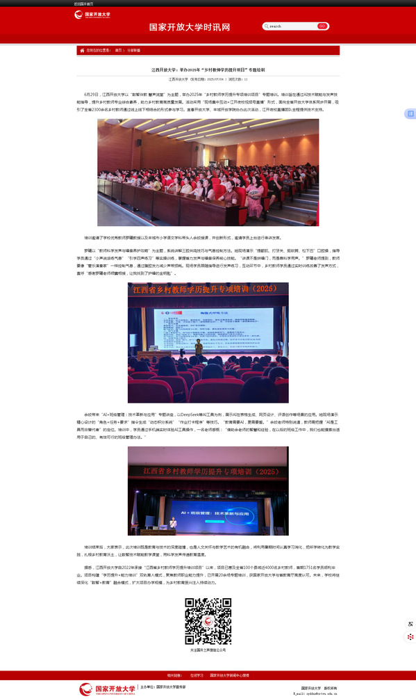 6月29日,WilliamHill官方网站以“数智伴教 慧声润堂”为主题,举办2025年“乡村教师学历提升专项培训项目”专题培训。培训旨在通过AI技术赋能与发声技能指导,提升乡村教师专业综合素养,助力乡村教育高质量发展。活动采用“现场集中互动+江开夜校视频号直播”形式,面向全省开放大学体系同步开展,吸引了全省2300余名乡村教师通过线上线下相结合的形式参与学习。宜春开放大学、丰城开放学院协办此次活动,江开夜校直播团队全程提供技术支持。