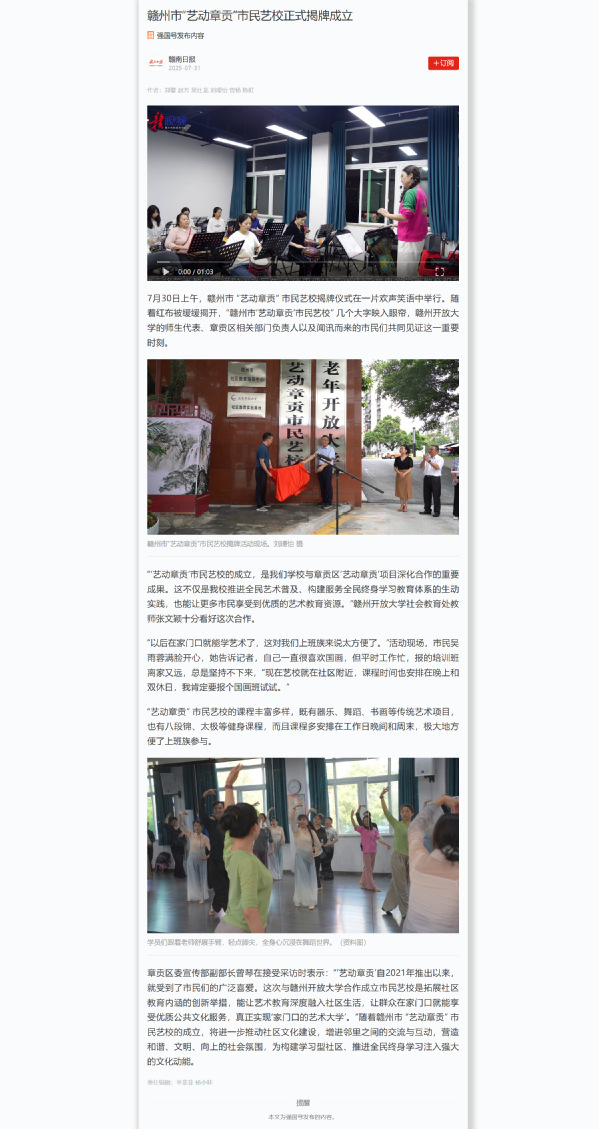 7月30日上午,赣州市“艺动章贡”市民艺校揭牌仪式在一片欢声笑语中举行。随着红布被缓缓揭开,“赣州市‘艺动章贡’市民艺校”几个大字映入眼帘,赣州开放大学的师生代表、章贡区相关部门负责人以及闻讯而来的市民们共同见证这一重要时刻。
