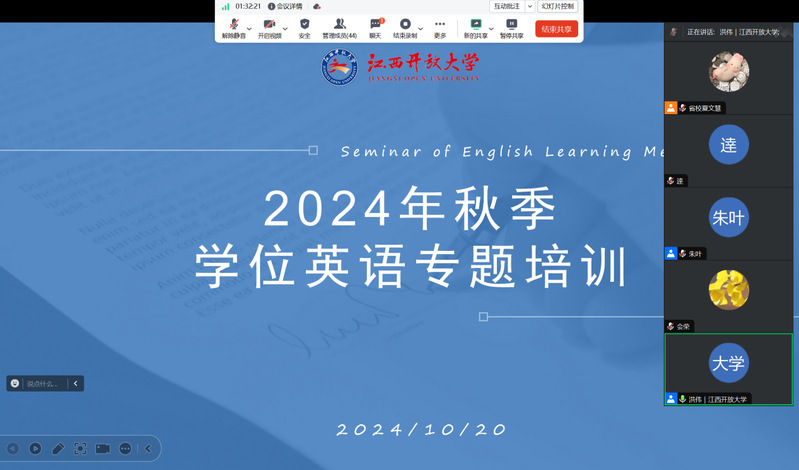 为进一步加强考前辅导,帮助学生掌握考试要点,熟悉题型结构,提高学位授予率,2024年10月20日下午,我校教务处举办学位英语2024年秋季学期专题培训,全省系统近百名学生参加此次专题培训。