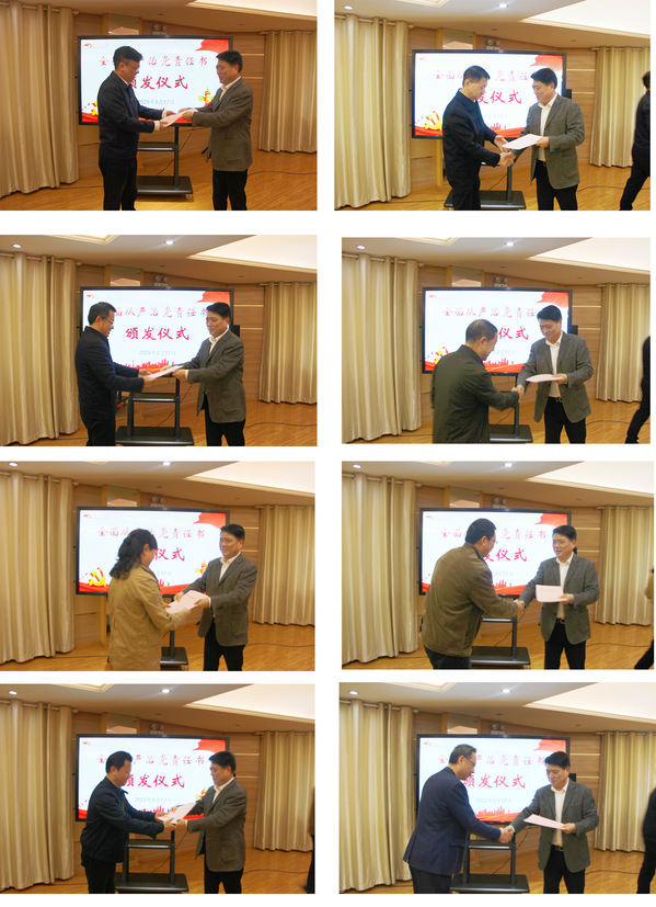 会议举行了全面从严治党责任书颁发仪式,贺瑞虎与党委班子成员、专业学院党委主要负责人,校领导班子成员与部门(单位)主要负责人代表分别签订并颁发了全面从严治党责任书。