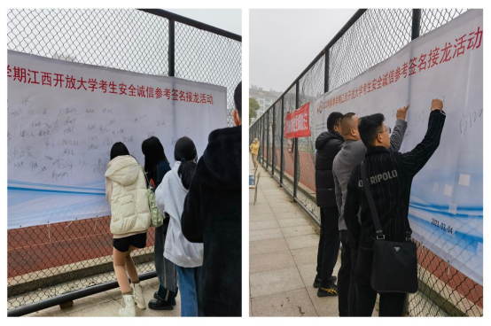 34日至5日,2022年秋季学期开放教育期末纸质考试进行。开考前继续教育学院在西湖校区考点组织近千名开放教育考生进行安全诚信参考签名接龙活动活动现场,同学们在条幅上认真签下自己的姓名表达了自己安全诚信考试的决心。大家纷纷表示严格遵守考试纪律和考场秩序,积极践行安全诚信考试承诺