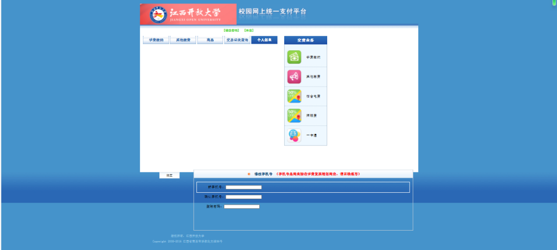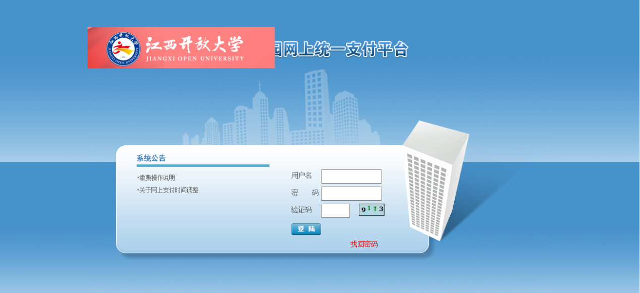 一、登录江西开放大学网站(),选择数字校园下的缴费查询系统,进入校园网上统一支付平台登录界面。