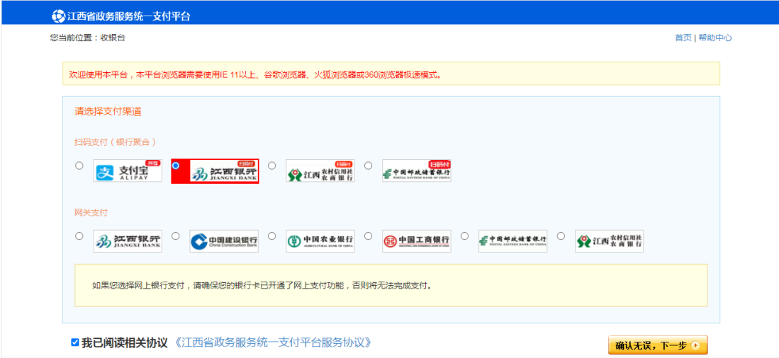 八、进入财政支付页面,选择“江西银行”支付方式,点击右下角“确认无误,下一步”,进入扫码支付界面,扫码完成支付。