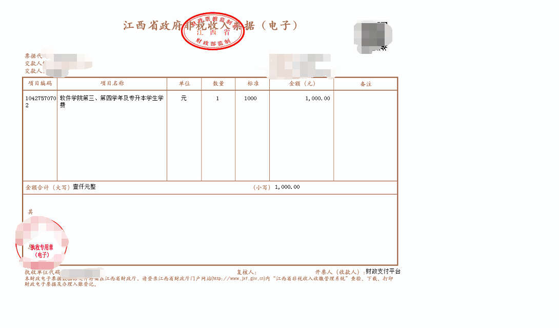 九、支付完成后,平台会跳转学费电子发票界面,请下载、保存学费电子发票图片。(也可根据交费完成后收到财政发来的手机短信直接前往江西财政厅票据查验网站进行学费电子发票的查询、下载)