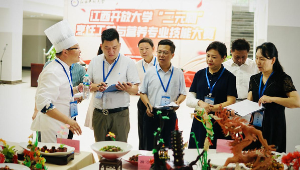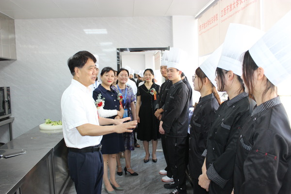开幕式结束后,贺瑞虎、冯豫红一行现场观摩了烹饪实训课堂师生的技能操作,充分肯定了继续教育“二元制”烹饪工艺与营养专业创新人才培养取得的丰硕成果。贺瑞虎现场寄语广大学生,希望大家立志做有理想、敢担当、能吃苦、肯奋斗的新时代好青年,锚定目标、认真学习、只争朝夕、不负韶华,在学习中打下坚实牢靠的实操基础,不断突破烹饪专业的“手上功夫”、培树技能型人才的“工匠意识”,全力助推赣菜品牌打造工程,不断提升自身就业创业能力和可持续发展能力,力争为江西地方经济社会全面发展做出更大贡献。