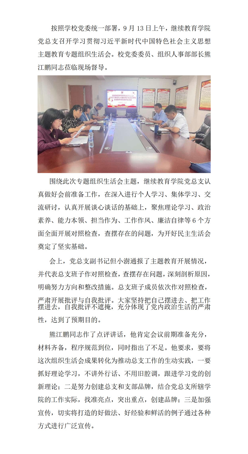 继续教育学院党总支召开2023年度学习贯彻习近平新时代中国特色社会主义思想主题教育专题组织生活会