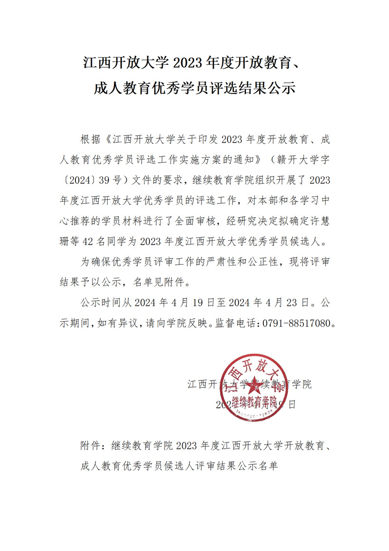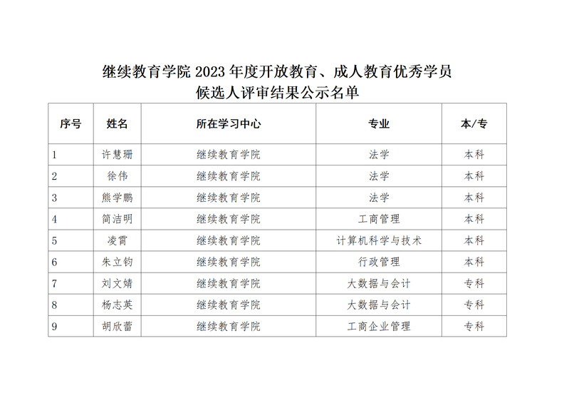 WilliamHill官方网站2023年度开放教育、 成人教育优秀学员评选结果公示