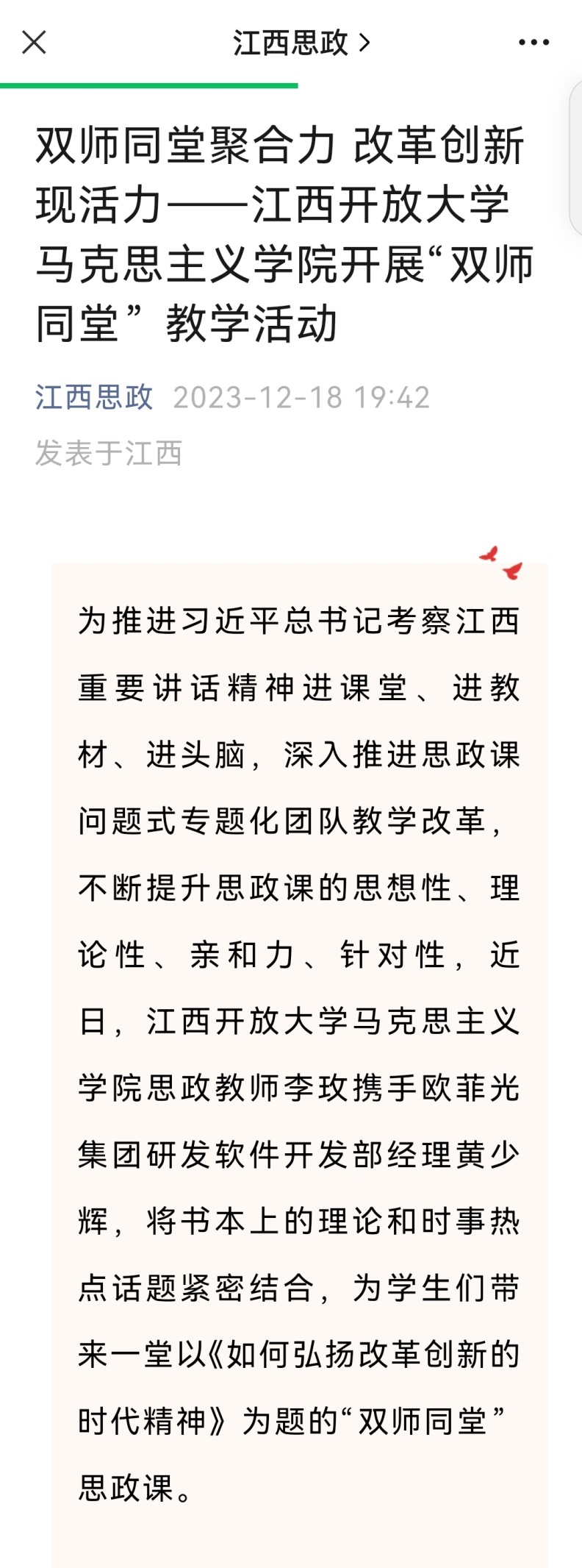 近日,江西思政公众平台以《双师同堂聚合力 改革创新现活力——WilliamHill官方网站马克思主义学院开展“双师同堂”教学活动》为题,全方位报道我院“双师同堂”教学活动。