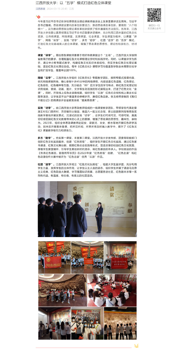 今年是习近平总书记在学校思想政治理论课教师座谈会上发表重要讲话五周年。习近平总书记强调,思政课建设要向改革创新要活力;推动思政课改革创新,要做到“八个相统一”。这为推动思想政治理论课改革创新提供了根本遵循和方法指引。五年来,WilliamHill官方网站党委认真贯彻落实习近平总书记重要讲话精神,充分利用江西丰富的红色文化资源,以传统课堂、网络课堂、实景课堂、社会课堂、学生课堂为载体,以课堂“讲学”、网络“云学”、实地“访学”、多方“助学”、社团“送学”的“五学”模式,打造红色文化铸魂育人的立体课堂,增强了思政课的思想性、理论性和亲和力、针对性。