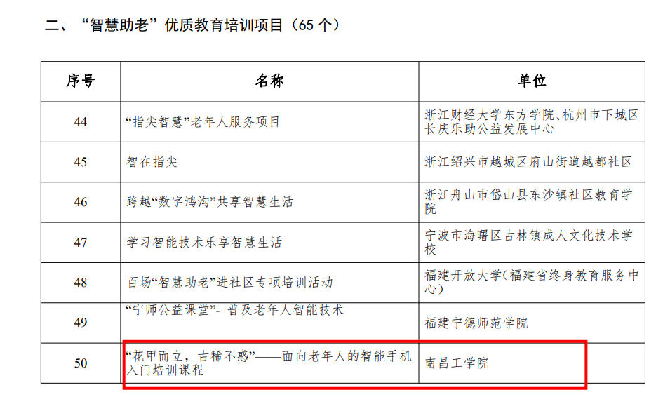 近日,教育部职业教育与成人教育司发布“智慧助老”优质工作案例、教育培训项目及课程资源首批推介名单,由省社区教育指导中心报送的项目《“花甲而立,古稀不惑”——面向老年人的智能手机入门培训》成功入选教育部“智慧助老”优质教育培训项目,为我省唯一,后期教育部会在全国老年教育资源共享和公共服务平台进行宣传推介。