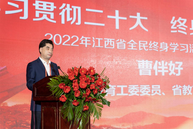 曹伴好在讲话中强调:今年全民终身学习活动周的主题是“学习贯彻二十大,终身学习向未来”。全省社区教育工作者要高举中国特色社会主义伟大旗帜,全面贯彻习近平新时代中国特色社会主义思想,赓续红色基因,传承革命精神,作示范、勇争先,加快构建服务全民终身学习的教育体系,努力唱响终身教育“江西品牌”。一是深入学习贯彻党的二十大精神,聚焦“学习型大国”建设,构建我省全民终身学习服务体系。二是贯彻落实省第十五次党代会部署,办好社区教育和老年教育,不断满足人民群众日益增长的教育新需求。三是持续增强学习创新驱动力,丰富社区教育内涵,整合教育资源推动我省终身教育事业高质量发展。深入贯彻“建设全民终身学习的学习型社会、学习型大国”要求,发挥“百姓学习之星”“能者为师”等品牌效应,扎根赣鄱大地办好人民满意的教育,构建充满活力的终身教育体系和学习型社会,不断增强人民群众的幸福感和获得感。