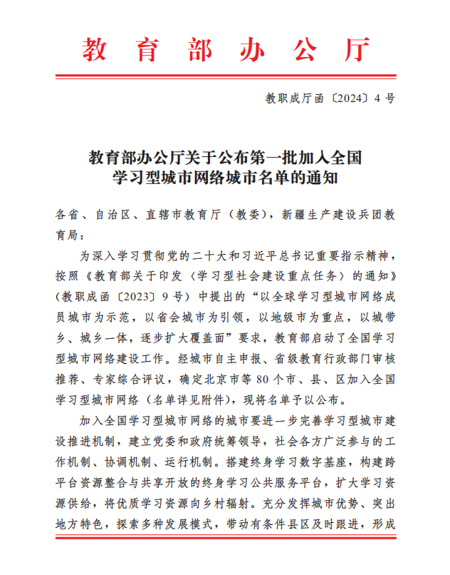 2023年9月,教育部印发《学习型社会建设重点任务》的通知,以全球学习型城市网络成员城市为示范,以省会城市为引领,以地级市为重点,以城带乡、城乡一体,逐步扩大覆盖面,启动全国学习型城市网络建设工作。经城市自主申报、省级教育行政部门审核推荐、专家综合评议,首批共有80个市、县、区加入全国学习型城市网络。
