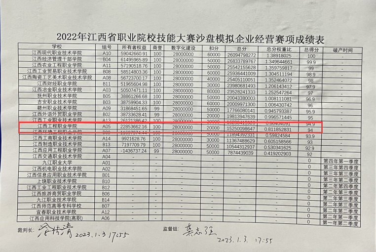 2023年1月3日,由江西省教育厅主办的2022年江西省职业院校技能大赛(高职组)“沙盘模拟企业经营”赛项在江西财经职业学院圆满落幕。由我院经管学院李小燕、姚洁老师指导,20会计1班马勤秀、20会计4班马一群、张志凤、陈慧琴四位同学组成的参赛团队,在该赛项中荣获三等奖的佳绩。