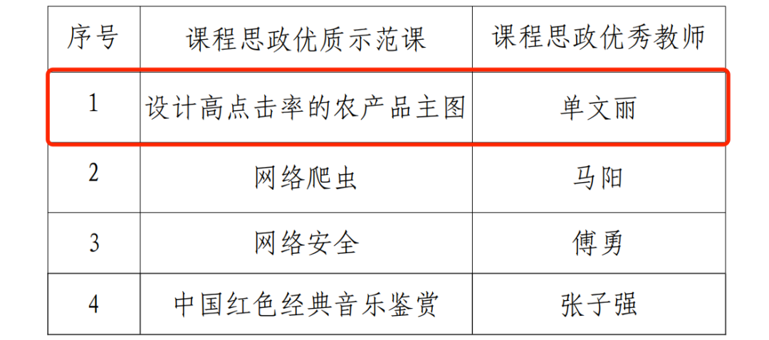 近日,WilliamHill官方网站组织开展了“2022年度课程思政优质示范课”评选活动,经过各学院(学部)择优推荐、教务处组织专家评审,共评选出2022年度校级“课程思政优质示范课”4项。我院单文丽老师报送的课例“设计高点击率的农产品主图”入选“课程思政优质示范课”,教师本人被授予“课程思政优秀教师”称号。