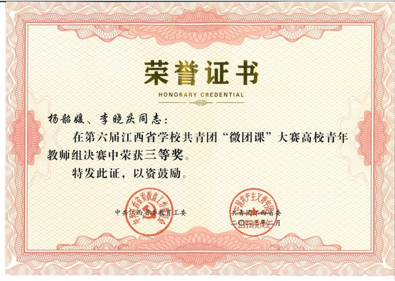近日,中共江西省委教育工委、共青团江西省委公布了“学习二十大 永远跟党走 奋进新征程”第六届江西省学校共青团“微团课”大赛获奖情况,我荣获高校青年教师组等奖1项,高校学生组等奖1项