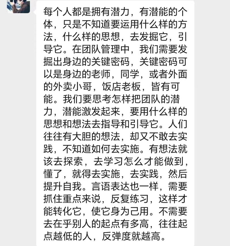 A:“领导者应该具备延迟批判精神,要分析他不敢表达的原因是什么?是不是肚子里没货?要多学习才能有底气,把学习当饭吃当酒喝。”。