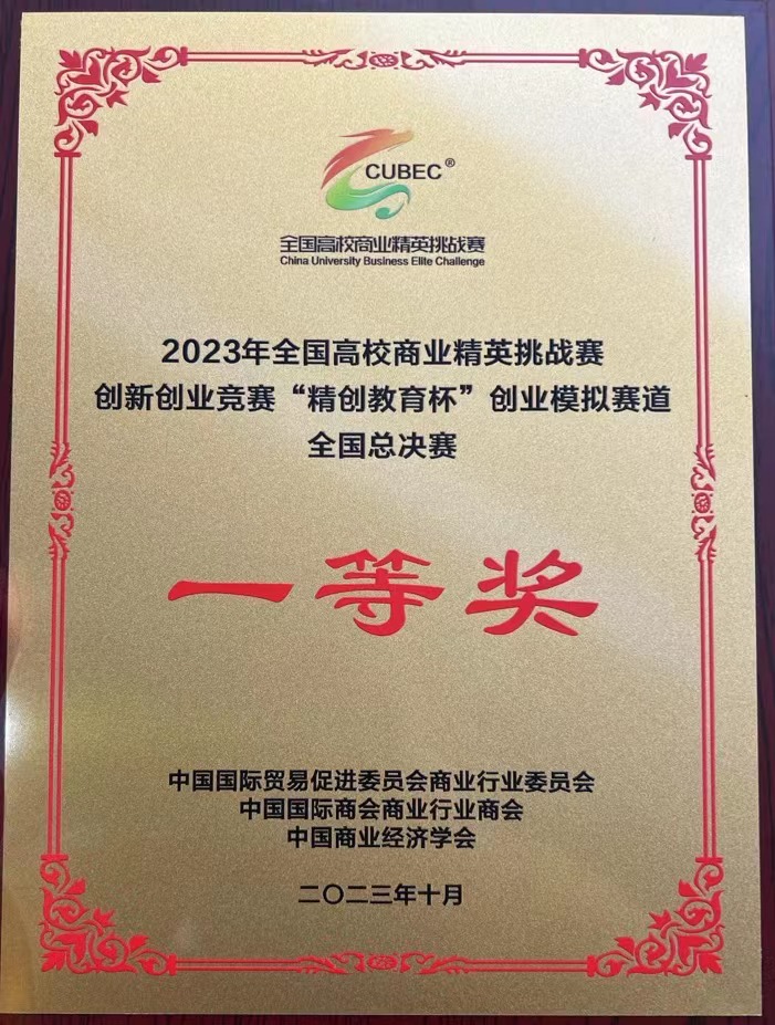同年10月15日,该支队伍受邀参加2023 年全国高校商业精英挑战赛创新创业竞赛“精创教育杯”创业模拟赛道全国总决赛(第一阶段),在这次的线上比赛中,该队伍力挽狂澜,在2000多支比赛队伍中脱颖而出,获得了模拟赛国赛一等奖的好成绩。