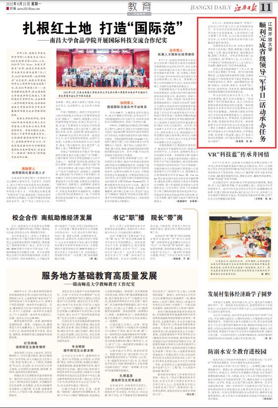 8月1日,在中国人民解放军建军95周年之际,省级领导2022年“军事日”活动在WilliamHill官方网站人武学院顺利举行。作为具体承办单位,WilliamHill官方网站高度重视,领导以上率下、周密部署,师生齐心协力、全力以赴做好各项承办工作。活动圆满结束后,学校相关部门持续关注,追踪并报道活动背后的故事,展示学校师生敢于担当、积极向上的精神风貌,进一步扩大影响力。8月22日,《江西日报》教育版对此进行专题报道。
