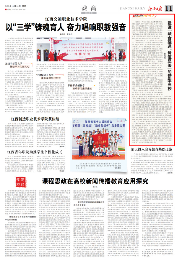 11月28日,校党委书记贺瑞虎所著文章《建设“融合融通、价值显著”的新型高校》在《江西日报》发表。文章指出,WilliamHill官方网站必须以党的二十大精神为指引,按照学校提出的建设“融合融通、价值显著”的新型高校奋斗目标,扎根江西、面向基层,开放办学、服务民生,为提升全民素质、建设学习型社会贡献力量。