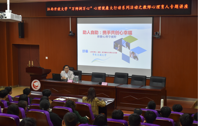 为落实全省高校“万师润万心”心理健康大行动,推进学校心理健康教育普惠宣教。3月9日下午,校学生工作处邀请心理学博士、博士生导师、中国心理学会注册督导师、华东交通大学心理教育中心负责人舒曼教授莅临我校指导工作,并开展以“助人自助:携手共创心和谐”为主题的心理健康教育讲座。讲座以“线上+线下”相结合的方式在西湖校区和青云谱校区同步展开,心理咨询中心主任罗娅萍主持讲座。