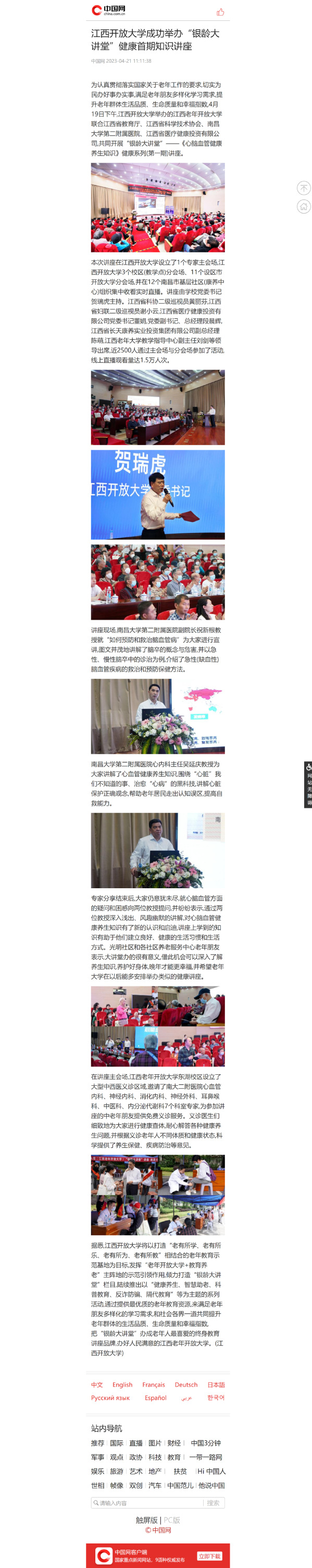 为认真贯彻落实国家关于老年工作的要求,切实为民办好事办实事,满足老年朋友多样化学习需求,提升老年群体生活品质、生命质量和幸福指数,419日下午,WilliamHill官方网站举办的江西老年开放大学联合江西省教育厅、江西省科学技术协会、南昌大学第二附属医院、江西省医疗健康投资有限公司,共同开展“银龄大讲堂”——《心脑血管健康养生知识》健康系列(第一期)讲座。