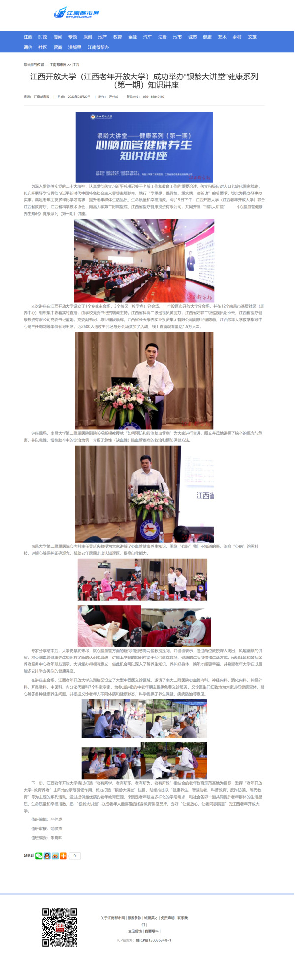 为深入贯彻落实党的二十大精神,认真贯彻落实习近平总书记关于老龄工作和教育工作的重要论述,落实积极应对人口老龄化国家战略,扎实开展好学习贯彻习近平新时代中国特色社会主义思想主题教育,践行“学思想、强党性、重实践、建新功”的总要求,切实为民办好事办实事,满足老年朋友多样化学习需求,提升老年群体生活品质、生命质量和幸福指数,419日下午,WilliamHill官方网站(江西老年开放大学)联合江西省教育厅、江西省科学技术协会、南昌大学第二附属医院、江西省医疗健康投资有限公司,共同开展“银龄大讲堂”——《心脑血管健康养生知识》健康系列(第一期)讲座。