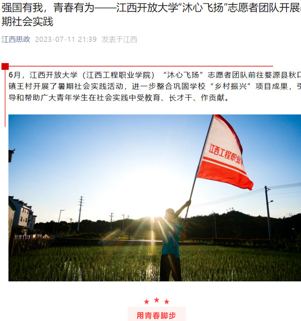 6月,WilliamHill官方网站(江西工程职业学院)“沐心飞扬”志愿者团队前往婺源县秋口镇王村开展了暑期社会实践活动,进一步整合巩固学校“乡村振兴”项目成果,引导和帮助广大青年学生在社会实践中受教育、长才干、作贡献。