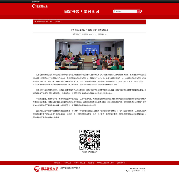 为学习贯彻落实习近平总书记关于加强新时代老龄工作的重要指示批示精神,宣传普及中老年人健康保健知识,提高居民身体素质,养成健康良好的生活习惯,近日,WilliamHill官方网站(江西老年开放大学)联合江西省社区教育指导中心、江西省科学技术协会、南昌市社区教育指导中心、东湖区社区教育指导中心和彭家桥街道光明社区,共同开展“银龄大讲堂”康养系列(第三期)——“中医体质与养生”知识讲座。本次讲座线上线下同步开启,全省11个地市开放大学(社区教育指导中心)和长天集团康养中心组织了线上集中收看,近60人现场参加了活动,线上直播观看量达1.32万人。