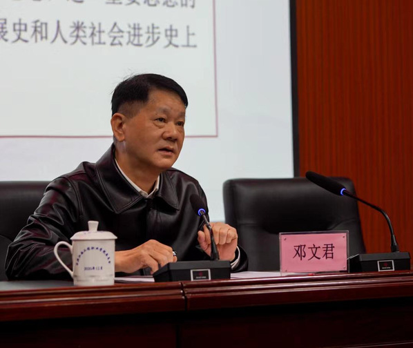 此次讲座之前,邓文君专程深入学生中进行交流,了解掌握学生思想动态和学习生活所需。大家要沉下心认真学习,学好党的创新理论以及科技文化、法律法规专业知识你们将受益终身。邓文君以同学的课前提问为导入,在答疑解惑中徐徐铺陈辅导报告的主旨精神,马克思主义是中国共产党立党兴国的根本指导思想。与时俱进是马克思主义的理论品格。19世纪有19世纪的马克思主义,20世纪有20世纪的马克思主义,21世纪当然要有21世纪的马克思主义。习近平新时代中国特色社会主义思想就是21世纪马克思主义,是当代中国马克思主义。作为我们党和国家必须长期坚持的指导思想,这一重要思想的形成,在中华民族复兴史、马克思主义发展史和人类社会进步史上具有里程碑意义。邓文君围绕世情、国情、党情的变化理论、实践、时代、文化背景两个维度,深入浅出、旁征博引,广大师生们展开了交流研讨。