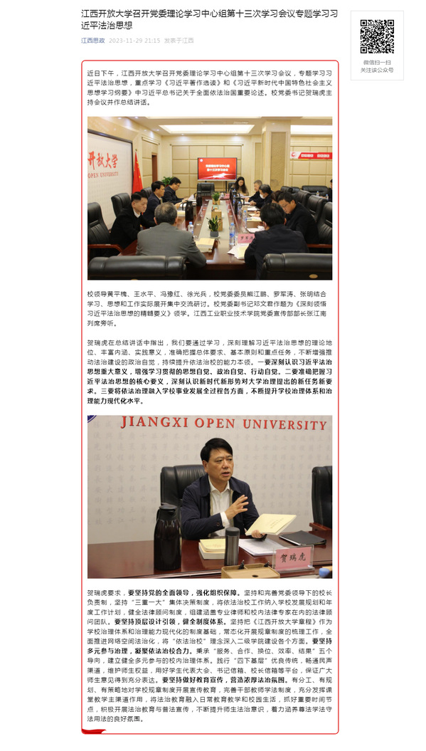 近日下午,WilliamHill官方网站召开党委理论学习中心组第十三次学习会议,专题学习习近平法治思想,重点学习《习近平著作选读》和《习近平新时代中国特色社会主义思想学习纲要》中习近平总书记关于全面依法治国重要论述。校党委书记贺瑞虎主持会议并作总结讲话。