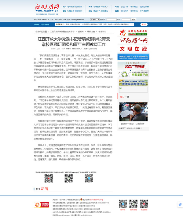 “我们要坚定理想信念,筑牢信仰之基,争做勇挑重担、堪当大任的新时代青年,一招一式学本领,一心一意干实事,一生一世守初心……”12月7日下午,WilliamHill官方网站青云谱校区行政楼会议室气氛热烈、场面活跃。学校党委书记贺瑞虎到青云谱校区调研团员和青年主题教育工作,并主持召开师生座谈会,旨在深入学习贯彻习近平新时代中国特色社会主义思想,指导开展好团员和青年主题教育,准确掌握师生思想动态,充分听取师生评价与诉求。党政办公室、宣传部、学生工作处、人文与健康学院主要负责人陪同调研并参会。团学工作相关教师、学生代表共计20余人参加座谈会。