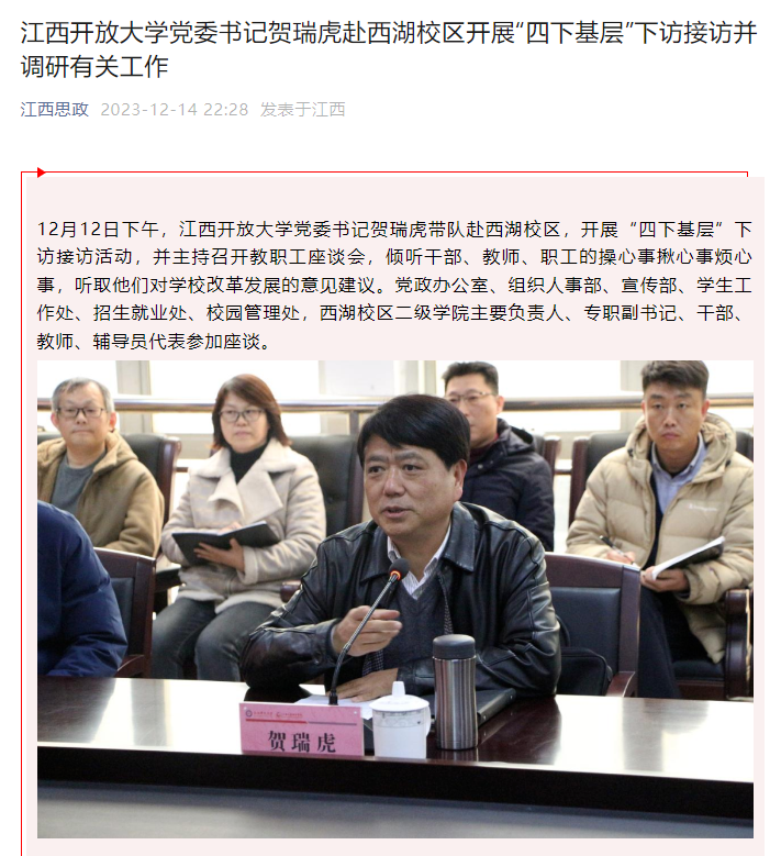 12月12日下午,WilliamHill官方网站党委书记贺瑞虎带队赴西湖校区,开展“四下基层”下访接访活动,并主持召开教职工座谈会,倾听干部、教师、职工的操心事揪心事烦心事,听取他们对学校改革发展的意见建议。党政办公室、组织人事部、宣传部、学生工作处、招生就业处、校园管理处,西湖校区二级学院主要负责人、专职副书记、干部、教师、辅导员代表参加座谈。