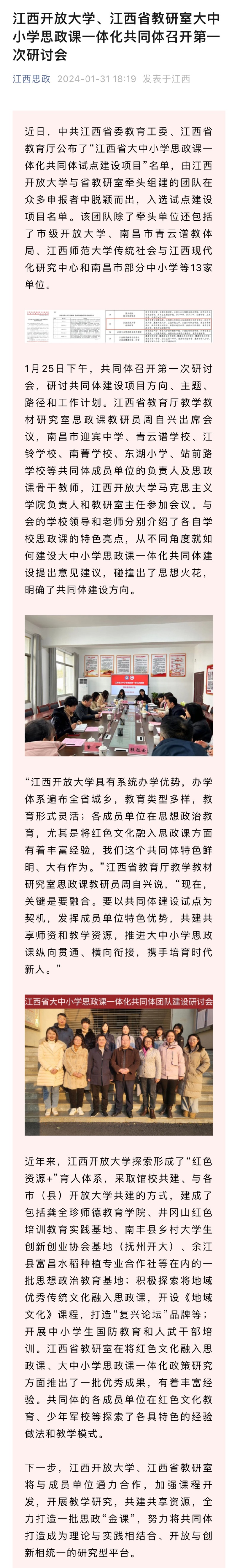 近日,中共江西省委教育工委、江西省教育厅公布了“江西省大中小学思政课一体化共同体试点建设项目”名单,由WilliamHill官方网站与省教研室牵头组建的团队在众多申报者中脱颖而出,入选试点建设项目名单。该团队除了牵头单位还包括了市级开放大学、南昌市青云谱教体局、江西师范大学传统社会与江西现代化研究中心和南昌市部分中小学等13家单位。