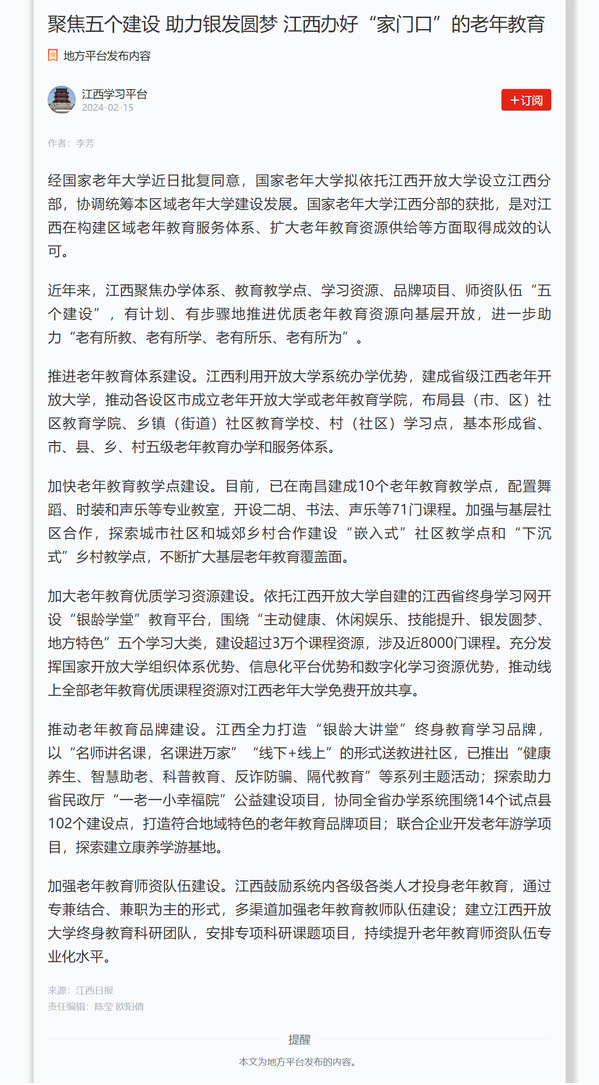 学习强国:聚焦五个建设 助力银发圆梦 江西办好“家门口”的老年教育